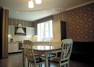 Третий полуэтаж: отдельная спальня с двуспальной кроватью, большая комната с небольшим диваном и четырьмя одноместными мобильными кроватями, которые сдвигается в две двуспальные.