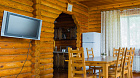 Номер категории «Стандарт с кухонной зоной» Номера в коттеджах из клееного бруса и бревна, общей площадью ~ 25 м2. Спальная комната оборудована спальным гарнитуром с двуспальной кроватью, прикроватными тумбами, плательным шкафом, комодом, диваном. Кухонная зона оборудована столом и стульями, керамической плитой, электро чайником, СВ печью, набором чайной, столовой и для приготовления посудой. Душевая кабина, санузел, необходимые туалетные принадлежности, фирменная косметика, халаты, тапочки, фен. Спутниковое TV, доступ к сети интернет Wi-Fi.