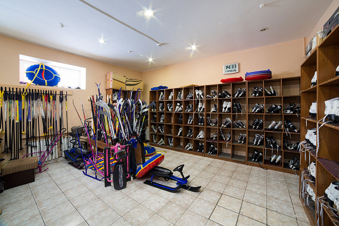 Летом здесь Вы можете взять на прокат скакалки, мячи (волейбольные, футбольные, волейбольные), обручи, велосипеды, роликовые коньки и скейтборды, набор для игры в большой теннис. Зимой - лыжи, коньки, клюшки, ледянки.
