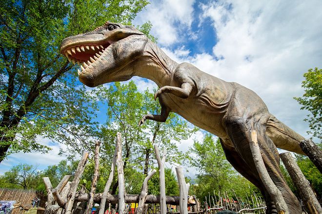 Куда пойти с ребёнком в выходные? Сегодня многие родители задаются этим вопросом. Парки давно исхожены, а обычные аттракционы поднадоели. В этом случае, предлагаем маленьким и взрослым посетить первый в России «Динопарк» под открытым небом на территории парка приключений «Веселый Дино»! «Динопарк» — это незабываемый отдых и море впечатлений. У нас вы сможете окунуться в доисторическую атмосферу и познакомиться с древними представителями животного мира. На территории нашего динопарка расположено множество экспонатов. Это хищные дейноних и аллозавр, травоядные протоцератопс и стегозавр,и конечно «царь» динозавров — ужасный тираннозавр! В парке приключений вы услышите настоящие звуки джунглей, рычание огромных ящеров и зверей. Объемный звук создаст атмосферу в которой жили доисторические чудовища. И даже на ощупь обитатели нашего динопарка оставят у Вас впечатление прикосновения к живой плоти. Также каждый из посетителей сможет сфотографироваться с динозаврами и с гордостью показывать это фото всем родственникам и друзьям.