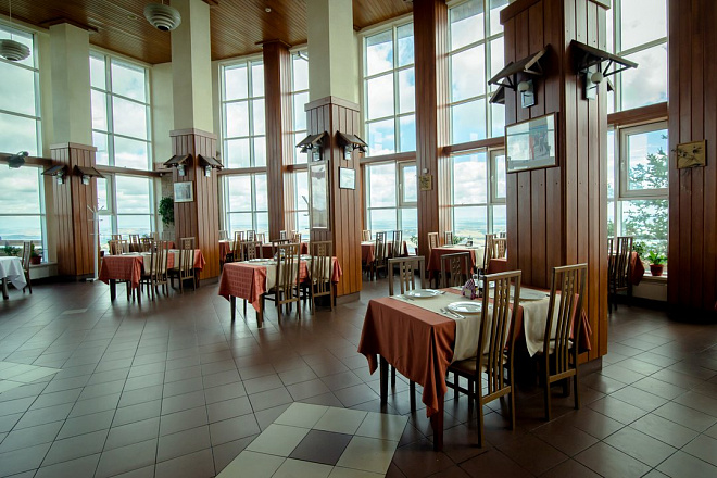 Это уникальный ресторан, расположенный на высоте 942 метра над уровнем моря. С вершины горы в любое время года открывается прекрасный вид на оз. Банное и окрестности. В ресторане всегда рады гостям и готовы к их приему, оборудованы стойки для лыж и сноубордов, работает гардероб, общее количество посадочных мест 90. Главным достоинством ресторана всегда остается его изысканная кухня.