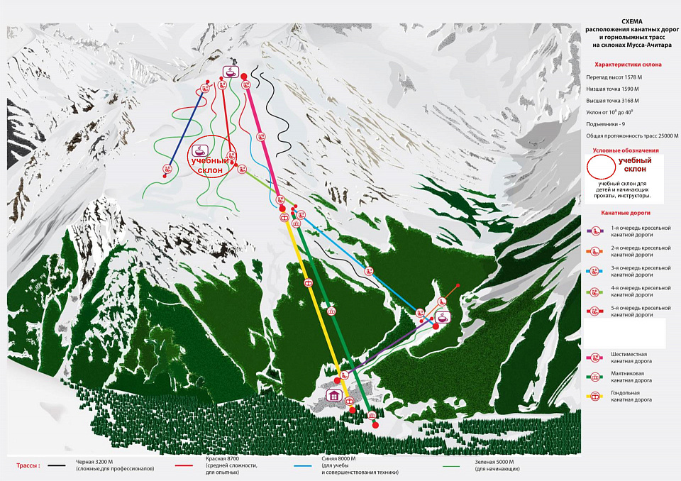 Маятниковая Канатная Дорога (1630-2260 метров): два вагончика вместимостью 20 человек каждый. Минует 2 и 3 очереди и поднимает с Домбайской поляны сразу в нижнюю границу зоны катания. Длина - 1970 м, время подъема - 8 минут (против 22 минут на двух креселках 2 и 3 очереди).