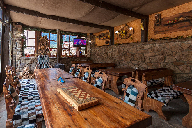Кафе рассчитано на 30 человек. Здесь Вас ожидает отменная кухня, уютный интерьер в стиле кантри и "живой" камин. В кафе организуются завтраки для гостей, при желании можно договориться об обедах и ужинах. Также на территории гостиницы есть летнее кафе. Самые популярные блюда это шашлыки из баранины, национальные пироги и речная форель, которые должен попробовать каждый, кто отдыхал в Домбае.