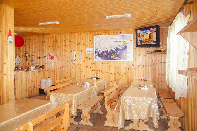 В меню: блюда кавказской кухни (шашлык, хычины, лагман, плов, шурпа, манты), а также горячий чай, кофе, шоколад, напитки, торты, свежая выпечка и др). Сопутствующие услуги: прокат горнолыжного снаряжения, хранение и сушка снаряжения, комнаты для ночлега.