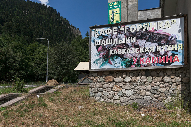 вы можно при желании пожарить себе шашлык. Удобно и оригинально сделаны столики. Все напоминает уютную и домашнюю обстановку. В кафе готовят любые блюда, но самые вкусные - это конечно национальные. Шорпа, хычины, шашлык, мясо по горски, и многое другое ждут вашей оценки. В кафе установлен DVD центр и хозяин с радостью поставит для вас любую музыку или клипы. Рядом с кафе установлены столики на прекрасной лужайке. Отсюда можно наблюдать великолепные Домбайские горы в сочетании с вкусной едой и приятной музыкой.