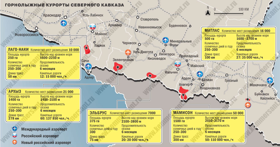 Самыми крупными курортами должны стать "Мамисон", где на 1,5 тыс. га планируется построить 300 км трасс и 50 тыс. мест для туристов, и "Архыз", где длина спусков составит 278 км, а гостиничных мест будет 21 тысяча.