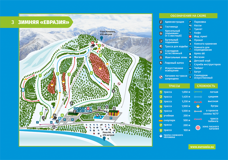 Описание трасс:"1 трасса" – трасса для "Новичков", продолжительностью 1,650 метров. По бокам трассы установлены небольшие трамплины. Рельеф склона отлично подходит для обучения технике катания и трассового фристайла. Пересекает "2 трассу" и "секретную трассу", имеет выход на "сноу парк" к джиббовой линии; "2 трасса" - трасса для райдеров "Среднего" уровня катания, продолжительностью 1,420 метров. Склон оснащен системой искусственного освещения. Продолжением трассы является "сноу парк". Рельеф склона отлично подходит для совершенствования техники катания: карвинг, "фан" карвинг, трассовый фристайл и многое другое. Пересекает "1 трассу" и "3 трассу", плавно переходит в "сноу парк"; "3 трасса" - трасса для райдеров "Высокого" уровня катания, продолжительностью 1,230 метров. Рельеф склона отлично подходит для спортивного катания; "4 трасса" - трасса для райдеров "Среднего" уровня катания, продолжительностью 1,500 метров. Меняющийся угол склона дает возможность научиться смене техники катания и проверить свои силы на постоянно меняющемся рельефе. "5 трасса" - трасса для райдеров "Среднего" уровня катания, продолжительностью 1,500 метров. На протяжении всей трассы установлены снежные фигуры: контруклоны, трамплины, бугры и другие неровности. Рельеф склона подходит для повышения и обучения техники катания в дисциплине "ски-кросс" и "бордер-кросс". "6 трасса" - трасса для "Начального" обучения, продолжительностью 200 метров. Рельеф и продолжительность склона идеально подходит для обучения основам техники катания на лыжах и сноуборде. "7 трасса" - небольшая трасса для фрирайда, переход на 5 трассу. Чтобы на нее попасть необходимо проехать по тропе, которая расположена напротив верхней станции подъемника. "8 трасса" - небольшая детская трасса оснащена детским канатным подъемником. На трассу допускаются только дети в сопровождении с инструктором детского клуба. "Сноу парк" - трасса для райдеров "Среднего" и "Высокого" уровня катания, продолжительностью 500 метров. Серия трамплинов, различные джиббовые фигуры и бугры позволят освоить технику фристайла и отлично провести время в кругу друзей. "Тропа снежного человека" - трасса для райдеров "Срднего уровня" катания и выше. Трасса открыта нашими клиентами и имеет предназначение "веселого спуска". Бугры, свисающие деревья и контруклоны дают возможность освоить технику внетрассового катания. АДМИНИСТРАЦИЯ НЕ НЕСЕТ ОТВЕТСТВЕННОСТЬ ЗА ТРАВМЫ ИЛИ ПОЛОМКУ СНАРЯЖЕНИЯ ПОЛУЧЕННЫЕ ПРИ СПУСКЕ ПО ЭТИМ ТРАССАМ. Трассы "Фрирайд" (неподготовленные склоны) - трассы для райдеров "Высокого уровня" катания расположены на 4,5,7 склонах и между ними в лесной зоне. Трассы имеют предназначение для спуска по необработанной местности. Бугры, свисающие деревья, контруклоны, "дропы" дают возможность освоить технику внетрассового катания. АДМИНИСТРАЦИЯ НЕ НЕСЕТ ОТВЕТСТВЕННОСТЬ ЗА ТРАВМЫ ИЛИ ПОЛОМКУ СНАРЯЖЕНИЯ ПОЛУЧЕННЫЕ ПРИ СПУСКЕ ПО ЭТИМ ТРАССАМ. "Трасса тюбинга" - трасса продолжительностью 200 метров, для тех, кто любит разнообразить свой отдых и приобщить своих близких к зимнему активному отдыху. Не важно, на сколько хорошо вы катаетесь на лыжах или сноуборде, трасса тюбинга подходит для всех. Крутизна склонов колеблется от 8 до 32 градусов.