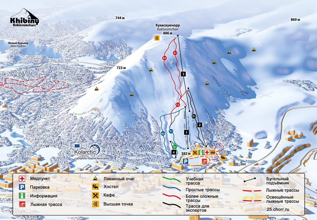Горнолыжный комплекс на горе Кукисвумчорр местные горнолыжники называют «25-й километр» - именно столько нужно проехать от Апатитов по дороге в заветный Кировск. Здесь есть трассы любого уровня сложности - место для катания найдет как новичок, так и профессиональный спортсмен. Еще одно неформальное название курорта - Мекка хибинского фрирайда. Кукисвумчорр - место проведения мирового этапа соревнований по фрирайду Freeride World Qualifier – Khibiny Open Cup.