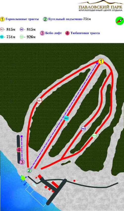 Поъемники: Бугельного типа с пропускной способностью до 900 чел/час. 4 оборудованных трассы для катания длинной от 800 до 1200 м., перепад высот – до 140 м.