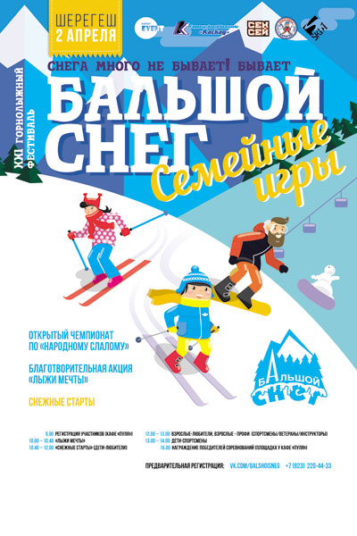 В самый разгар весны 2016, 2 апреля, Шерегеш объявляется территорией «Семейных игр», где в рамках XXI Горнолыжного фестиваля «БАльшой снег» пройдет «Первый открытый семейный чемпионат по «Народному слалому».
