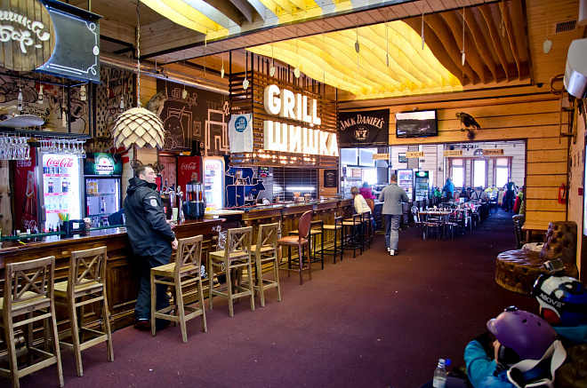 Находится оно на выкате с трассы, напротив нижней станции гондольного подъемника "Сектор Е". Здесь большой выбор безалкогольных и крепких напитков, вкусных блюд.
