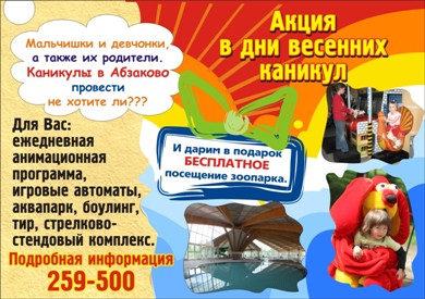На горнолыжном курорте Абзаково детей ждет ежедневная анимационная программа, аквапарк, боулинг, тир и многое другое. Специальное предложение от курорта - поход в зоопарк в подарок.