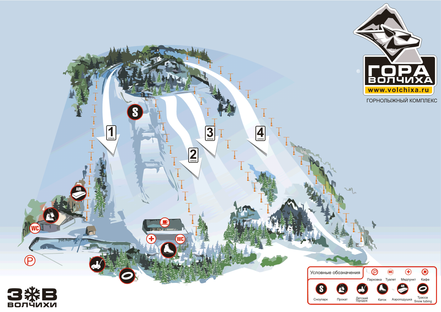 Горнолыжный комплекс "Гора Волчиха" включает в себя 4 склона протяженностью 700 м (перепад - 143м), 800м (100м), 900м (100м), а так же трассу длиной 1200м (200м), где уклон достигает 30`в начале спуска. Все трассы обслуживаются ратраком, оснащены подъемником бугельного типа фирмы Tatrapoma ("тарелка") с пропускной способностью 2000 чел./час. Действует система искуственного оснежения. Функционирует сноупарк и трасса для тюбингов. |