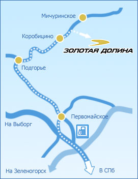 Через «Скандинавию»: Доехать до развилки на Первомайское (ориентир — фирменная заправка и стоянка дальнобойщиков ВЭНКО). Здесь можно сразу повернуть на Первомайское или повернуть на Первомайское через несколько километров, сразу после того, как Вы проедете под виадуком. Далее, на единственном перекрестке в Первомайском — поворот налево. С этой дороги, но уже в поселке Подгорье, поворот направо на Мичуринское. Проезжаете Коробицыно и видите, что дорога спускается в долину. Если Вы едете в гостиницу «Золотая Долина» или в ресторан «Шишка», то спускаться не надо, а на перекрестке за п. Коробицыно (с рекламными щитами 3×6) надо повернуть направо на гравийную дорогу. Спустившись же вниз в долину и сразу повернув направо, Вы придете к нашему центру — к подъемникам и кассам.