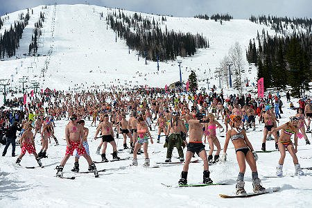 Сотни человек в купальниках и плавках съехали с горы Зеленая на горных