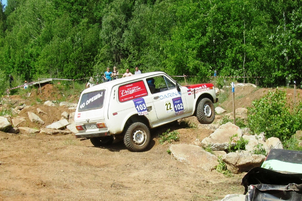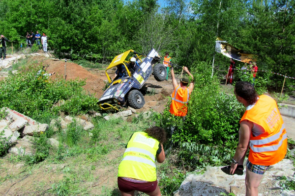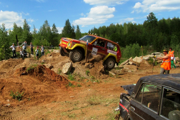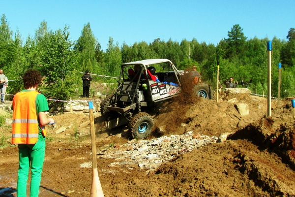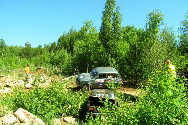 До обеденного узбекского плова и шашлыков, подготовленных партнером соревнований Абдрахмановым Сайфутдином, все участники вовремя проехали три секции, хотя не обошлось и без эвакуаций, бетонные препятствия, рыхлый грунт не отпускали некоторые автомобили. Во время обеденного перерыва спортсменов судьи провели перестановки курсовых ворот, усложнив трассы в секциях. Больший интерес для зрителей вызывала секция №5 где к грудам бетона, блокам были добавлены два автомобиля, перед которыми были установлены курсовые ворота. Первую попытку взятия этих ворот сделал экипаж из Звездного Сокирко Владимир/Сталин Андрей на Ниве, но маленький радиус колес Нивы не позволил с капотов ВАЗов запрыгнуть на крышу, однако попытка заслужила восторженные аплодисменты многочисленных зрителей. А вот для экипажа Зыков Константин/Казымов Роман на подготовленном УАЗе такое препятствие оказалось вполне под силу.