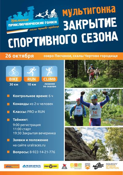 С первыми холодами во многих экстремальных дисциплинах заканчивается спортивный сезон. Чтобы отметить это событие, организаторы мультигонки Ural Adventure Race приглашают всех любителей приключений и активного отдыха 26 октября на озеро Песчаное и скалы Чертово городище.