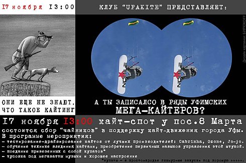 17 ноября 2007 г. в Уфе, на поле около поселка 8-е Марта, уфимский кайт-клуб проведет официальное открытие зимнего кайт-сезона 2008 (начало в 13 часов). Мероприятие проводится с целью дать старт предстоящему сезону, популяризации кайтинга и развеселого общения. Приглашаются все старые друзья уфимского кайт-клуба, и конечно же все, кто только заинтересовался этим видом спорта, но при этом еще не имел возможности или смелости самому ощутить всю мощь и динамику кайта.