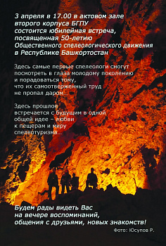 3 апреля в актовом зале второго корпуса БГПУ состоится юбилейная встреча, посвященная 50-летию Общественного спелеологического движения в Республике Башкортостан.