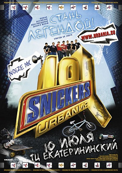 Фестиваль SNICKES@URБANиЯ уже прошел в Красноярске и Новосибирске, теперь на очереди - город Екатеринбург. Десять лет фестиваль SNICKES@URБANиЯ двигался по стране, собирая на асфальтированных площадках крупнейших городов России самую продвинутую и активную молодежь, каждое лето привозя с собой море драйва, даря тонны позитива. С момента своего появления в далеком 2001 с каждым годом Snikers@URБANиЯ набирала популярность, предоставляя своим поклонникам возможности для апгрейда, помогая развивать свои таланты и открывая новые имена. Одним словом, за 10 лет существования фестиваль по праву может быть назван легендарным, и в 2010 пришло время вспомнить, как это было и громко это опраздновать.