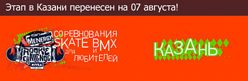 Menergy Rookie Challenge - серия соревнований, которая объединяет Skate & BMX, продолжает перемещаться из города в город, собирая на главных площадях самых продвинутых райдеров. И в одном из пунктов произошли изменения. Очередной этап в Казани перенесен на 07 августа!