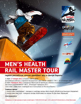 17 января в Лааксе (этап 1) и 04 февраля (этап 2) в Авориазе состоится ночное джиббинг шоу Men's Health Rail Master как среди любителей, так и лучших российских профессиональных атлетов. Соревнование пройдет на специально подготовленной площадке при искусственном освещении непосредственно в центре курорта. Хорошее настроение для всех гостей будут создавать DJ Андрей Пирумов (Flammable beats), DJ Маша Пирумова (DJ Sestra, Low Budget Family) и постоянный русский MC SteppaStyle. Все стильные трюки будут сопровождаться бурными аплодисментами и громким ударом в гонг. Все происходящее будет комментировать известный сноуборд –TV комментатор Жора Стеценко. Обязательным критерием является предварительная регистрация и соблюдение индивидуальной техники безопасности (шлем). Награждение победителей пройдет в этот же день на специальной вечеринке от программы приключений MHadventure. Многочисленные призы от партнеров ждут своих победителей.