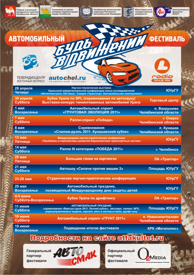 Одни из самых активных автоспортивных организаторов в Челябинске — студенты и выпускники автотракторного факультета ЮУрГУ — решили, что Челябинску нужен свой автомобильный фестиваль. Сказано — сделано. 28 апреля стартует Первый автомобильный фестиваль в Челябинской области «Будь в движении!».