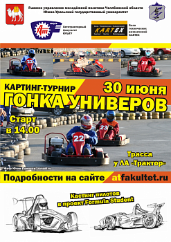 Автотракторный факультет ЮУрГУ, база технических развлечений «KARTEX» и Главное управление молодёжной политики Челябинской области приглашают на первый студенческий картинг-турнир «Гонка универов».