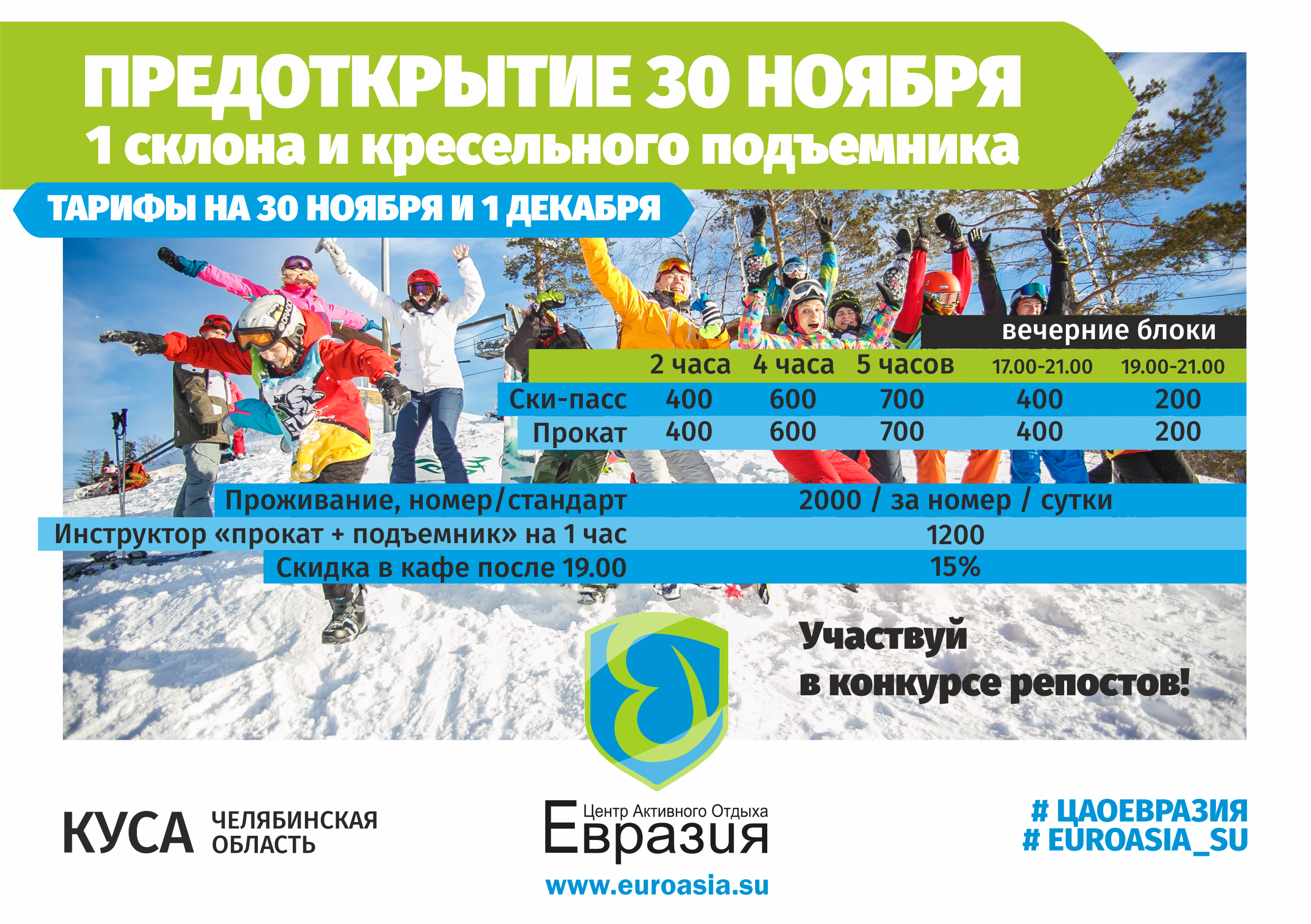 ЦАО «Евразия» ждет всех на открытии 1 склона и кресельного подъемника в предстоящие выходные!