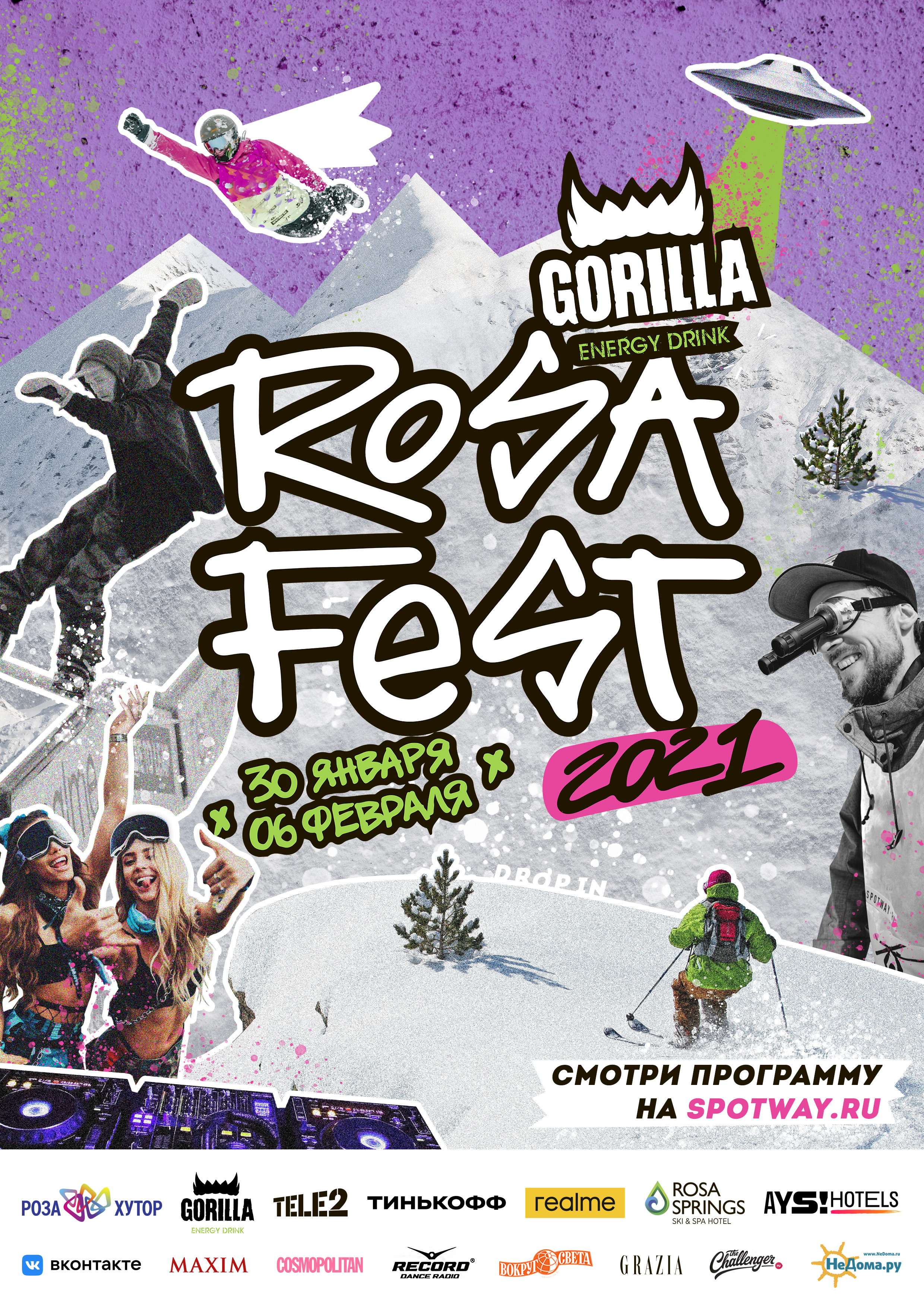 Шестой ежегодный Rosafest на горном курорте «Роза Хутор» в этом году состоится при поддержке постоянного партнёра Gorilla Energy в самый снежный период зимы - с 30 января по 6 февраля 2021 года.