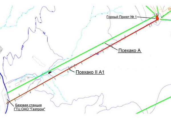 На схеме: канатные дороги ГТЦ ОАО «Газпром» - «Псехако А» и «Псехако II А1».