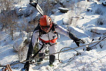 Старт внизу - подъём по маршруту пешком до КП, с закреплённым на рюкзаке спусковым комплектом (лыжи или сноуборд), далее спуск на принесённом с собой снаряжении до финиша.