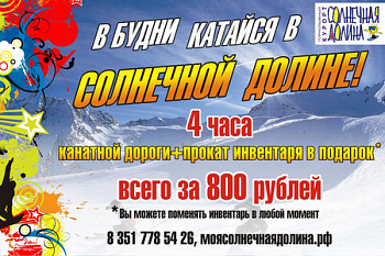 Тариф «Жаркий снег»: абонемент на канатную дорогу (4 часа) + прокат комплекта горнолыжного снаряжения = 800 руб.