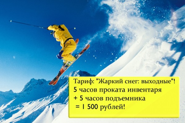 "Солнечная Долина" продлила действие тарифа "Жаркий снег", который действовал в январе, до конца февраля. По нему в будни можно взять в прокат снаряжение и пользоваться подъемником 4 часа за 800 руб. И по многочисленным просьбам посетителей, появился тариф выходного дня: 5 часов подъемов и аренда оборудования за 1500 руб.