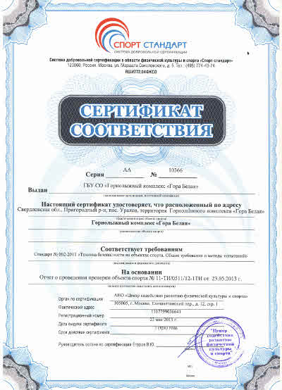 По результатам проведенных испытаний спортивного сооружения "Горнолыжный комплекс "Гора Белая", на основании Отчета о проведении проверки объекта спорта № 11-ТИ/0511/12-1ТИ от 23 мая 2013 г., выполненного ООО "Спорт Тест", АНО "ЦСРФКиС", было принято решении о соответствии технических характеристик вышеуказанного спортивного сооружения требованиям Стандарта № 002-2011 "Техника безопасности на объектах спорта. Общие требования и методы испытаний" СДС "СпортСтандарт".