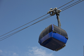 В этом типе канатных дорог кабинки подвешены не на одном, а сразу на трех канатах. На фото ниже узел крепления кабинки на канатах в увеличенном масштабе — хорошо видно, как ролики передвигаются по двум несущим канатам (они имеют более ровную поверхность), а средний канат является тяговым, приводящим кабинки в движение. Такая конструкция обеспечивает максимальную надежность и безопасность пассажиров, а также позволяет обойтись относительно малым числом промежуточных опор — при длине 5369,7 метров, на этой дороге используется всего 5 опор (высотой 64, 39, 66.5, 78.5 и 48 метров).