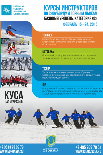 С 15 по 24 февраля 2015 года на территории ГЛЦ «Евразия» состоятся курсы по подготовке инструкторов категории «С» по горнолыжному спорту и сноуборду.