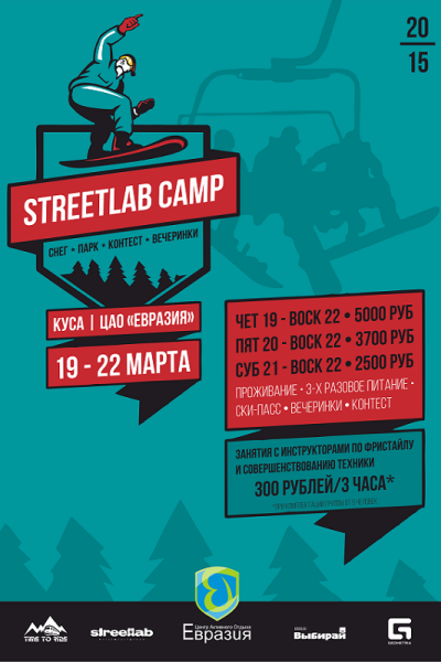 Сноуборд-лагерь для взрослых StreetLab Camp – спортивно-развлекательный сноубордический лагерь, который пройдет с 19 по 22 марта. Формат лагеря совмещает в себе небольшой парк, ежедневные занятия с инструкторами, вечеринки, соревнования и развлекательные программы.