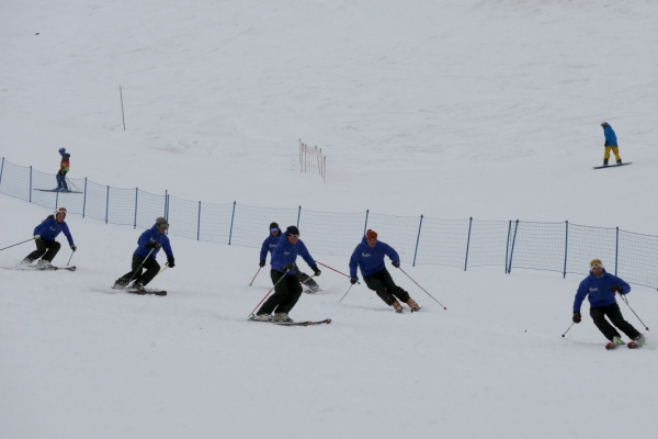 Соревнования горнолыжников и сноубордистов не завершили первый день - его продолжила квалификация по демо-соревнованиям, где 7 инструкторских команд показали своё техническое мастерство в синхронных спусках.