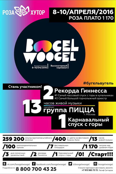 8-10 апреля на курорте «Роза Хутор» прогремит первый высокогорный карнавал Boogel-Woogel! Это значит, что в эти дни на горе будет безраздельно править атмосфера самых ярких фестивалей мира – от карнавала в Рио-де-Жанейро до Каннского кинофестиваля. «Роза Хутор» станет настоящим снежным Лас-Вегасом!