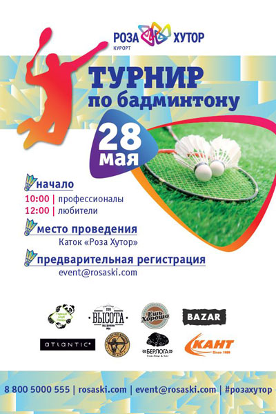 28 мая, 27 августа и 29 октября на горном курорте «Роза Хутор» состоятся турниры по бадминтону в дисциплинах: одиночные, парные и семейный соревнования.