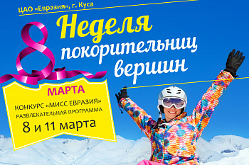 8 марта в ЦАО «Евразия» с 14:00 у подножья склона будет проходить развлекательная программа. Конкурсы, викторины и, конечно же, ценные призы и подарки ждут всех покорительниц вершин.