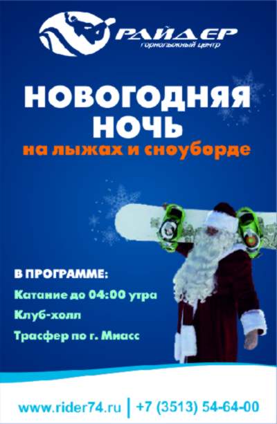 Райдер" встретит всех любителей экстремальных видов спорта с 00:00 до 04:00 утра. Всю ночь для Вас работает служба проката и канатная дорога. На 1 этаже будет организован клуб-холл с приятной музыкой, ди-джеями и светом. На склоне - катание с дедом Морозом за призы и подарки. Снежная горка для детей и взрослых.