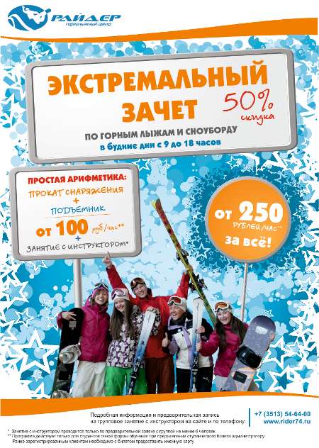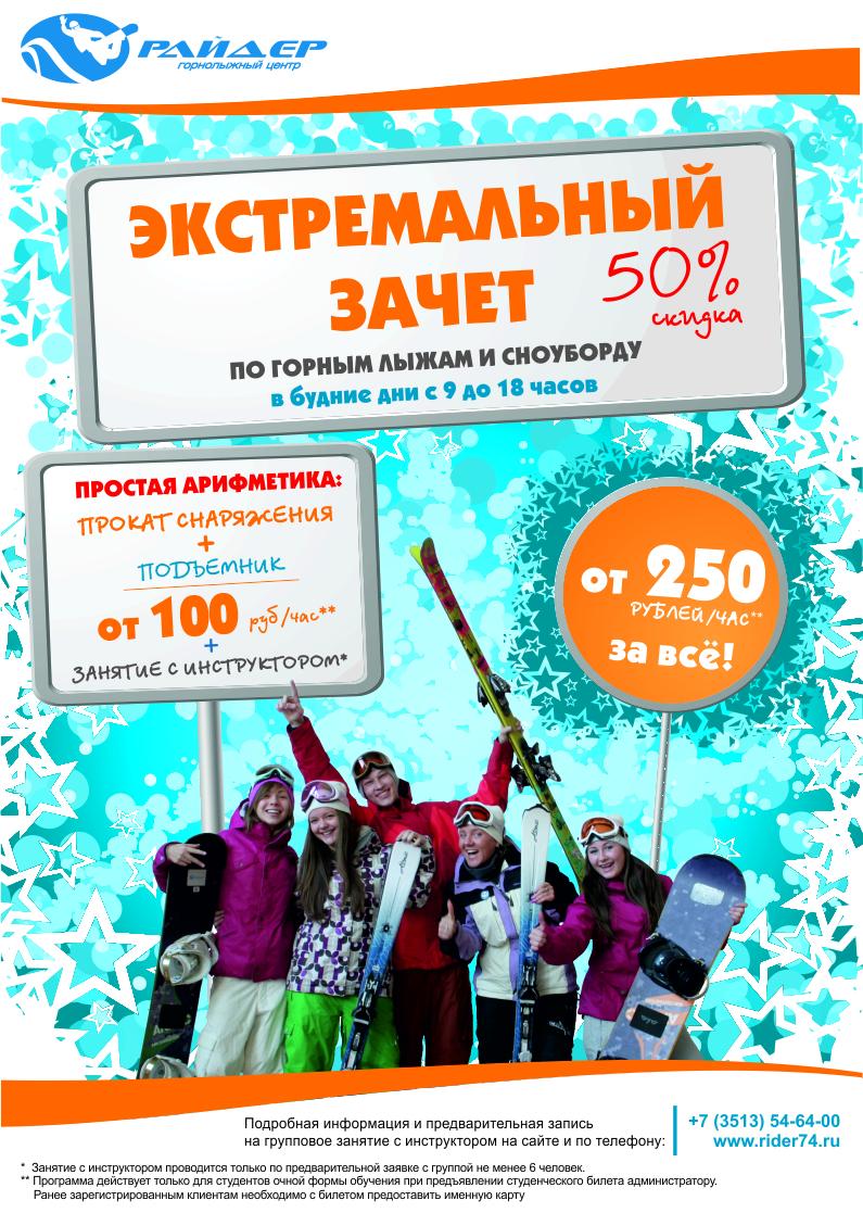 В конце сезона, для всех студентов пройдет экстремальный зачет, на котором каждый сможет показать свои достижения за прошедший сезон и побороться за главные призы от горнолыжного центра "Райдер".