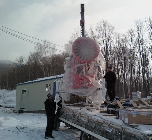 26 января в Арсеньев привезли долгожданный груз: снежную пушку (Demac) и насос (Carpari), необходимые для работы системы оснежения на горе.