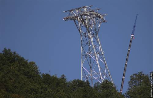 Как видно на фотографии, конструкция опоры не походит на опоры уже существующих в Красной Поляне канаток и выглядит довольно внушительно (высота ее более 50 метров), и это не удивительно — как мы уже писали, одна кабина новой канатки будет вмещать 30 человек, а длина самой дороги составит 5,1 км.