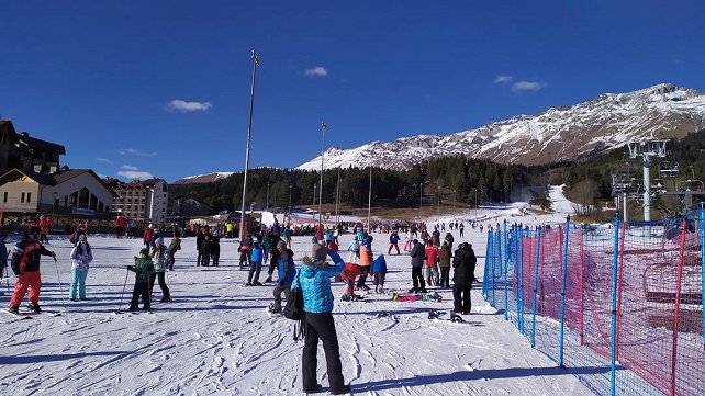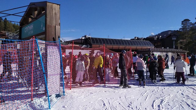 катать. На Северном склоне попадаются небольшие камешки, объезжаемо без проблем, но на черной их слишком много. Сноу парк на Лунке это просто волнистая трасса, на ней хорошо учиться перед выходом на фрирайд. На Романтике есть горка на нижнем участке красной трассы, если разогнаться, то можно слегка прыгнуть. На короткой учебной синей насыпают горки для соревнований, на одну можно было заехать. Скипасс на 2 часа отменили, если брать инструктора, то 300 р час. Много людей просят продать скипасс в обед, так как на полдня в кассах нет. Жмоты. На фото типичная длина очереди на четырехкреселку Спутник.