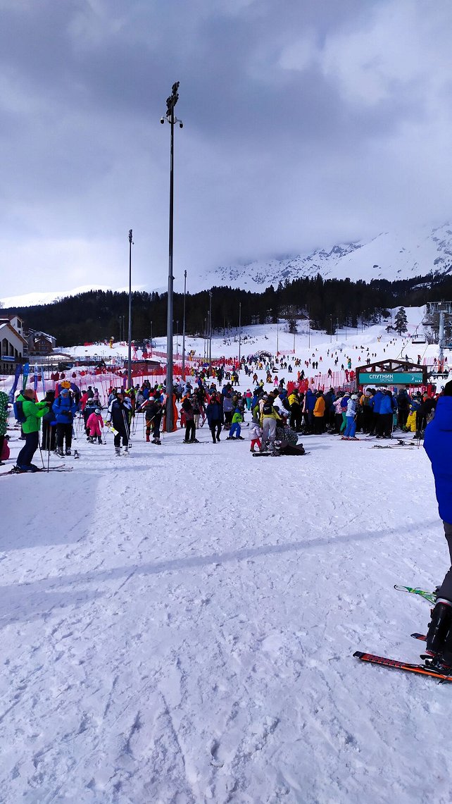 ушатали. Очереди на подъемники минут на 7-10. По лесу все выкатано, но проезжаемо. Наверху севера людей меньше всего. Очень много детей на трассах, в том числе без родителей. А также много летающих ломов.