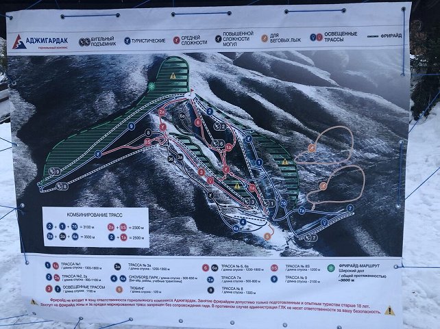 Покатался в аджиге в воскресенье. Трассы возможно когда-то и были хорошо подготовлены. Но сегодня похоже был день сноубордиста - их было до неприличия много. Плюсом, свежевыпавший снег, пурга и теплая погода внесли свои коррективы. И трассы к 11 ч уже были перепаханы вдоль и поперек. Лыжникам было не легко, карвингом не покатаешься. Пришлось вспомнить ветхий "годиль" (классику). Зато в лесу снега море, фрирайд удачный получился сегодня. Теперь о деталях. Скипасс 2т.р. за 4 часа. На целый день скипаса нет и в будущем не будет. В будние дни ГЛЦ не работает. Только в выходные. Хотя на въезде до сих пор красуется реклама ГЛЦ со словами "Двух дней мало". Для кого оставили рекламу- не понятно. Туалеты не работают. Ни "М, ни "Ж". Уже третью неделю (!). На середине трассы 1 стоит сломанный ратрак. Поднимаясь на подъемнике №8 увернулся от летящего с самого верха сноуборда (!). По счастливой случайности этот снаряд задел только канатчика, никого не пришиб. А ведь мог запросто убить, такие случаи известны. На автостоянке к 11 ч мест не было, авто парковались за территорией ГЛЦ, вдоль дороги. И да, трассы 8 и 4 существуют только на карте, реально их нет. А жаль, трасса 4 очень удобная при выкате с трассы 3а на стоянку. А трасса 8 когда-то вообще интересна была своим рельефом с серпантином и длинным красным спуском. Трасса 8s - это ерунда по сравнению с нею. Но не смотря на минусы, все равно аджигардак притягивал и будет притягивать к себе.
