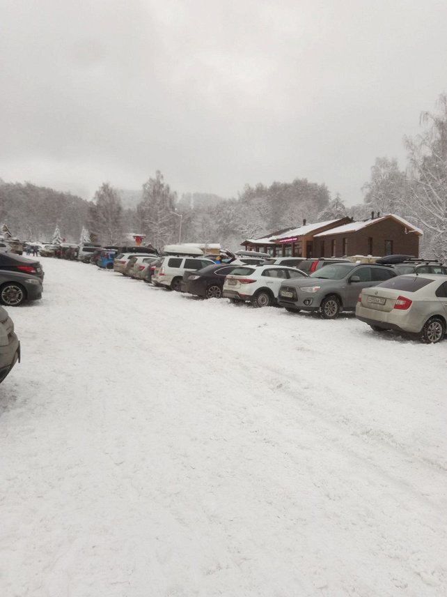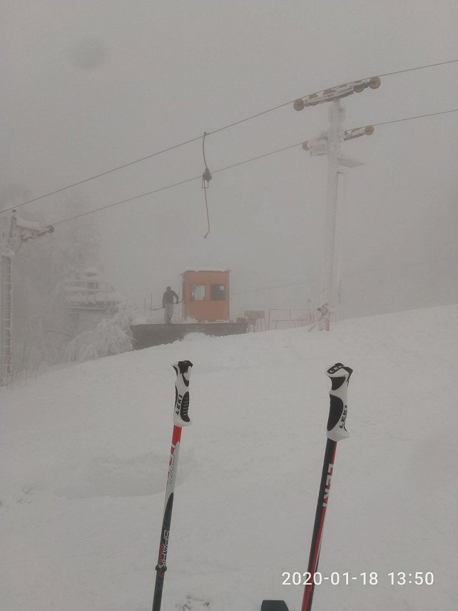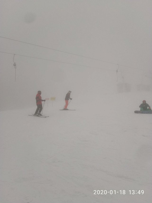 Работают трассы 1,3,6,8, 9. Кататься лучше на широких мягких лыжах. Узкие и средние зарываются. Для фрирайда сегодня просто песня. К сожалению туман наверху не позволяет насладится катанием.Народу много, стоянка машин забита, но очередей нет.